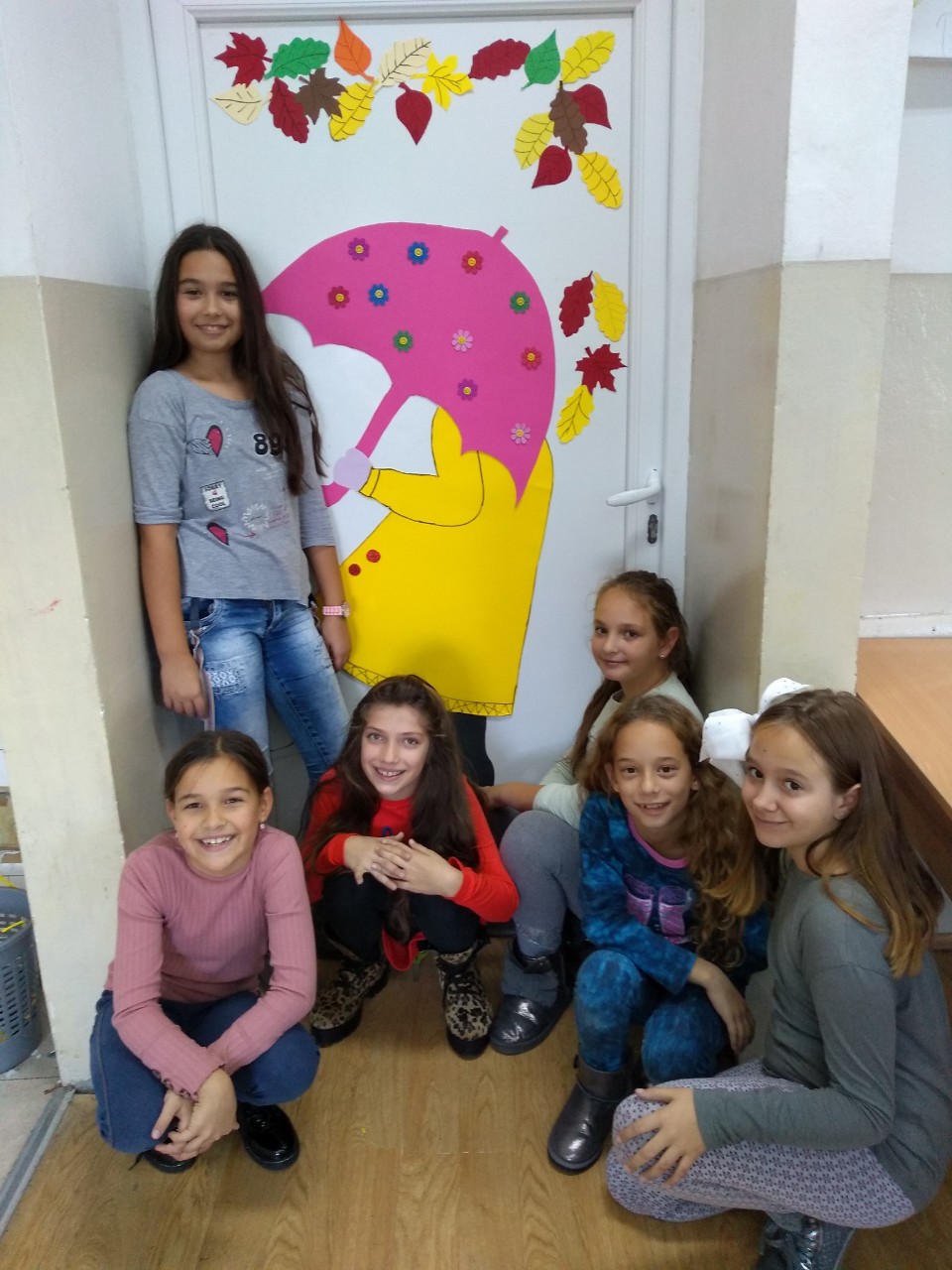 Креативна радионица 25/11/2019 Ученици који похађају часове креативне радионице ,,обукли“ су своју учионицу у јесење одело. Кабаница, кишобран и ветар неизоставни су елементи јесени па су и учионици поклонили део јесење гардеробе.